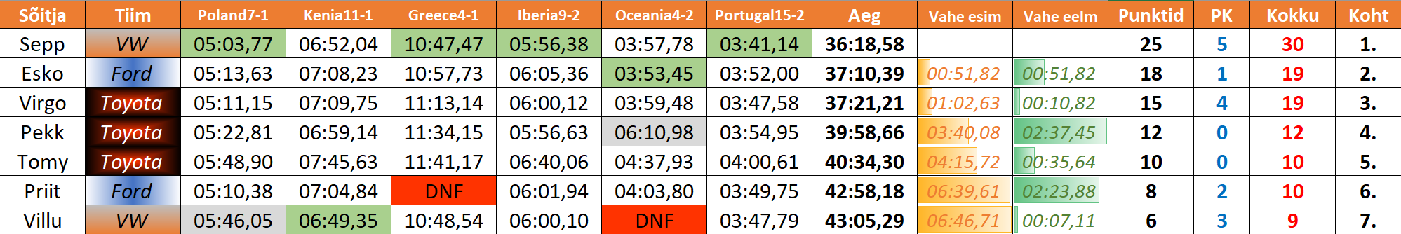 | Sepp | VW | 16 | 8 | 30 | 11 | 29 | 15 | 30 | 15 | 30 | 21 | 13 | 22 | 240 | 2. |